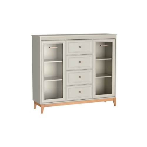 במרכז הקומודה ארבע מגירות נוחות לשימוש יומיומי. בצדדים שתי דלתות זכוכית עם מדפים להצגת פריטים דקורטיביים ולאחסון נוסף.