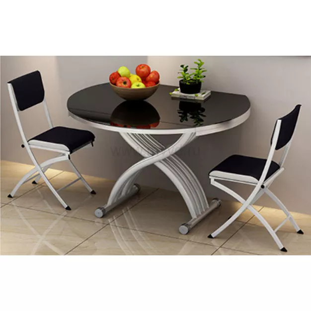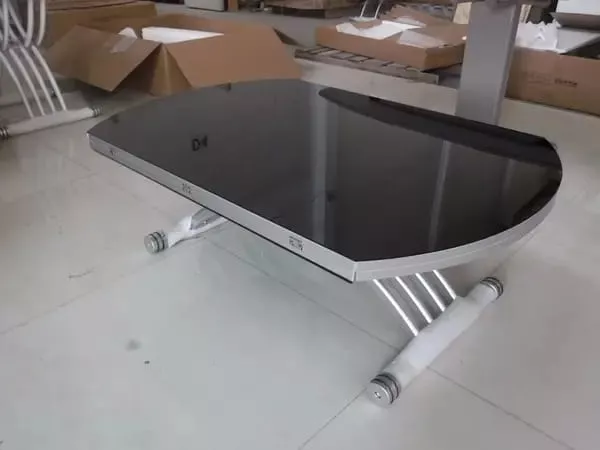 - שולחן טרנספורמר מודרני, פלטת השולחן עשויה מזכוכית מודבקת על עץ.