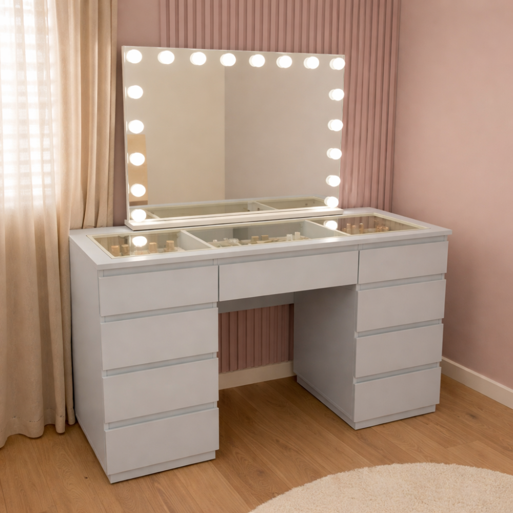 שידת איפור דגם לינוי בעיצוב יוקרתי עם זכוכית עליונה.