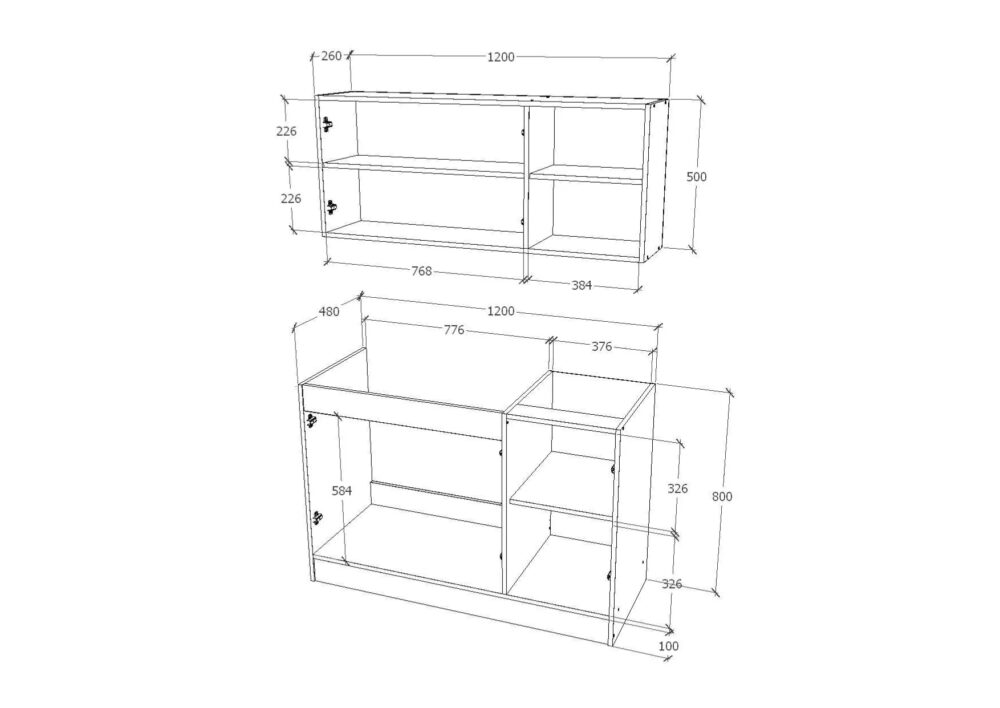 ארונות עליונים: ארון מרכזי עם שתי דלתות ללא חלוקה, ושני חלקים פתוחים בצדדים עם מדף מובנה בכל צד. גובה הארונות העליונים – 50 ס"מ.