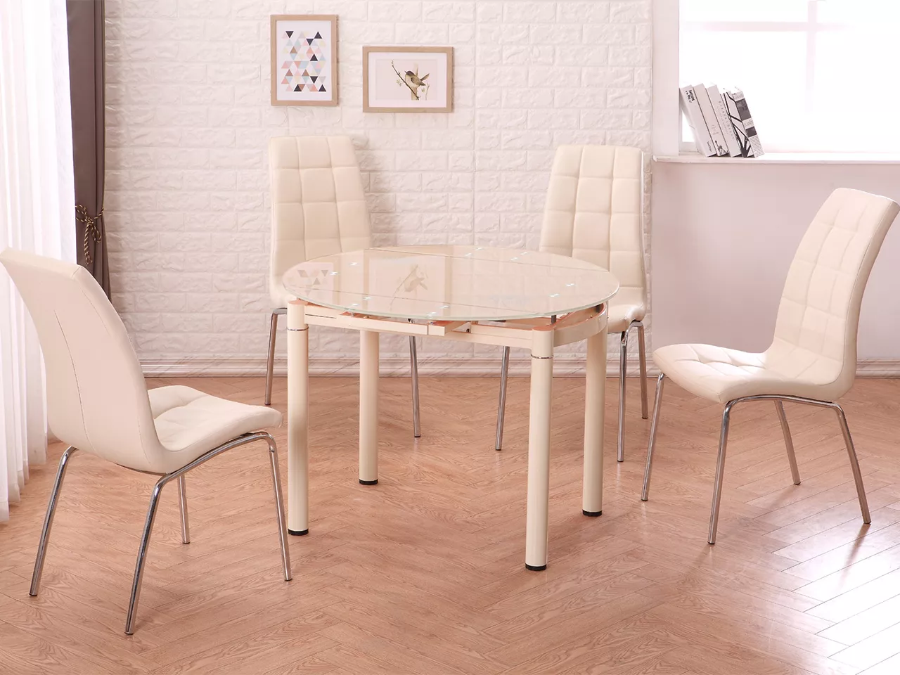 כוללת 4 כיסאות + שולחן עגול מזכוכית ורגליות עץ בצבע קרם